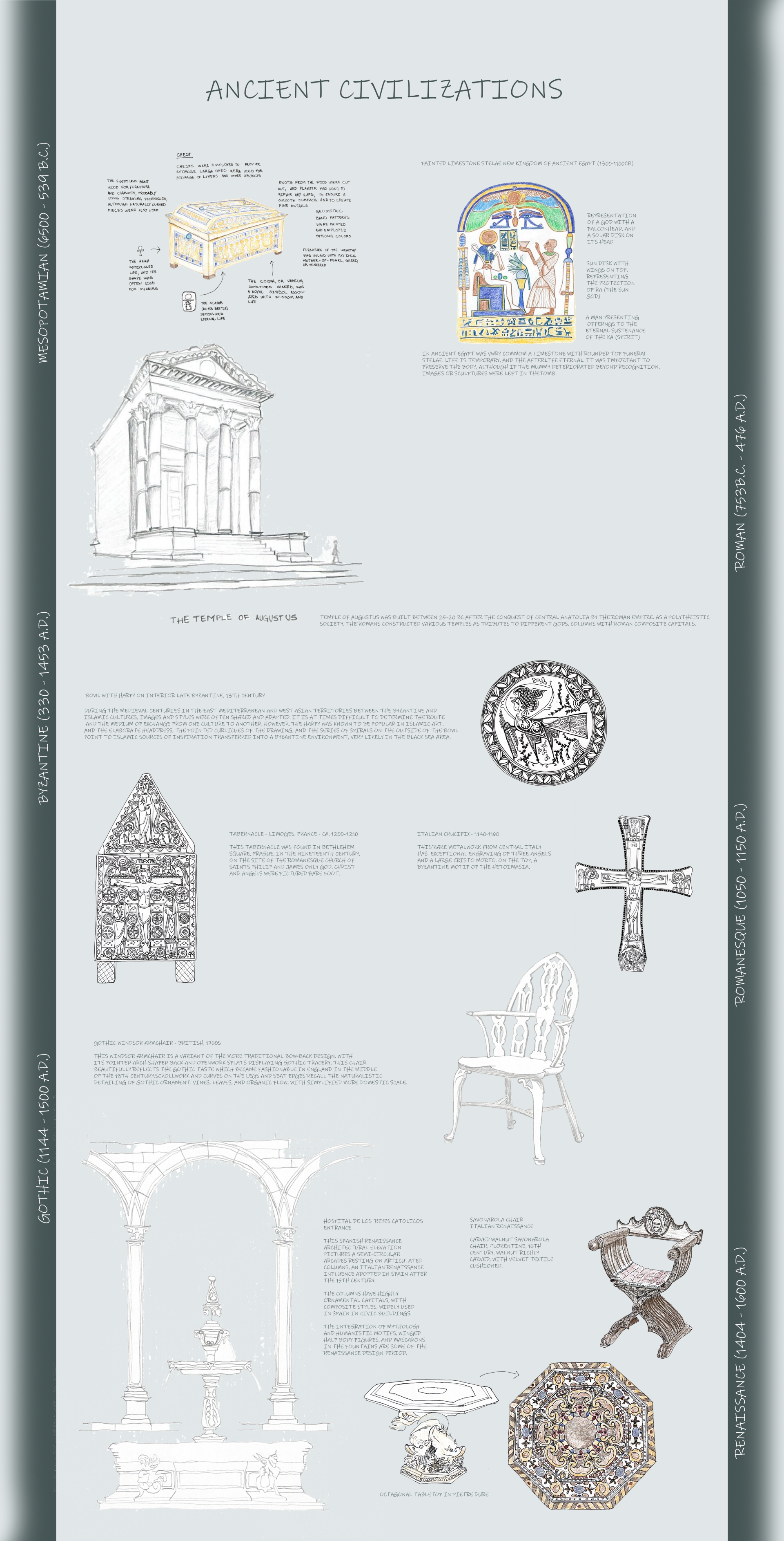 History of Interior Design course has unfolded each period revealing how architecture expresses human beliefs, power, ritual, and beauty. From ancient civilizations shaping sacred forms to Gothic altarpieces elevating spiritual awe, from Renaissance rationality and ornament to the French influence on modern interiors, I learned to read design as cultural language. I explored how façades, furniture, textiles, and decorative arts evolved across eras. Linenfold carving mimicked drapery, Spanish and Italian Renaissance details communicated prestige, Chinese roof curvature was meant to guide energy, and Buddhist spiritual intent shaped spatial experience. I discovered that interiors are never isolated objects but reflections of philosophy, identity, technology, and aspiration. This class strengthened my ability to analyze symbolism, identify stylistic characteristics, and relate historical concepts to contemporary practice. History of Interior Design I deepened my appreciation for design as an ongoing narrative that continues to shape the way we live.